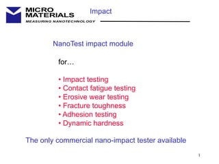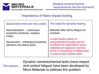 The document details advanced nano-impact testing techniques to assess the dynamic mechanical properties and performance of materials, particularly focusing on fatigue wear and failure in coatings and ceramics. It highlights the capabilities of measuring adhesion energy, dynamic hardness, and time-to-failure across various materials and conditions. The testing aims to bridge the gap between theoretical nanoindentation results and real-world applications, enabling better prediction and optimization of material behavior under fatigue conditions.