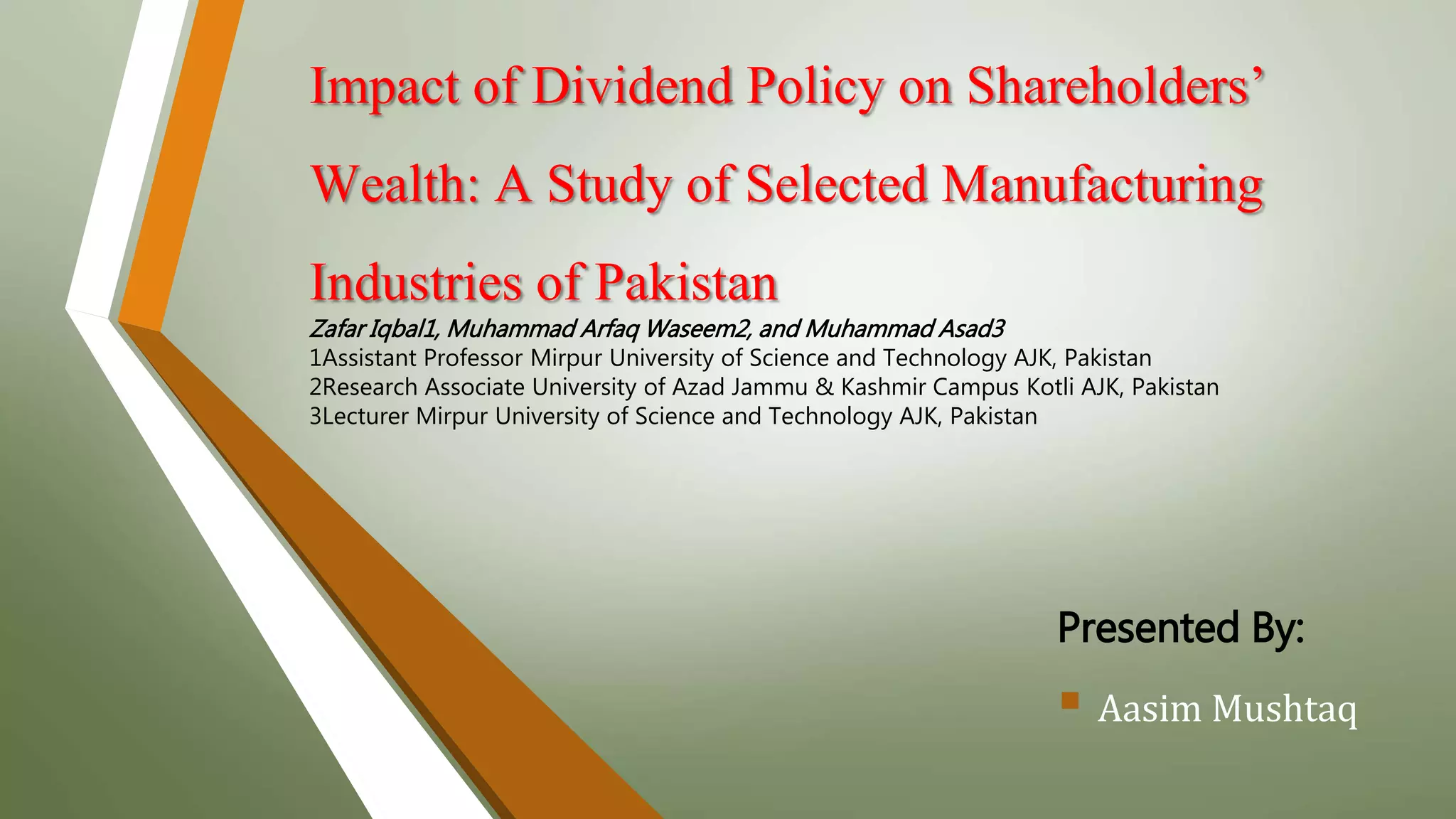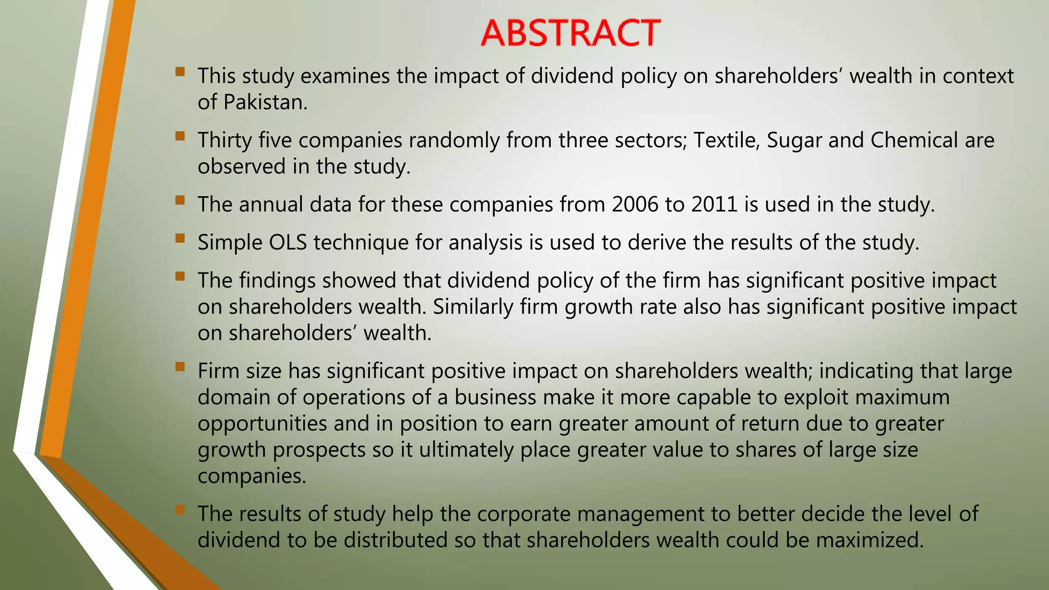 This study investigates the impact of dividend policy on shareholders' wealth in selected manufacturing industries in Pakistan, analyzing 35 companies across textile, sugar, and chemical sectors from 2006 to 2011. The findings indicate that a firm's dividend policy, growth rate, and size significantly and positively affect shareholder wealth, highlighting the importance of stable dividend payments for attracting investors. Ultimately, credible dividend policies can enhance market value and influence financial decision-making among corporate managers.