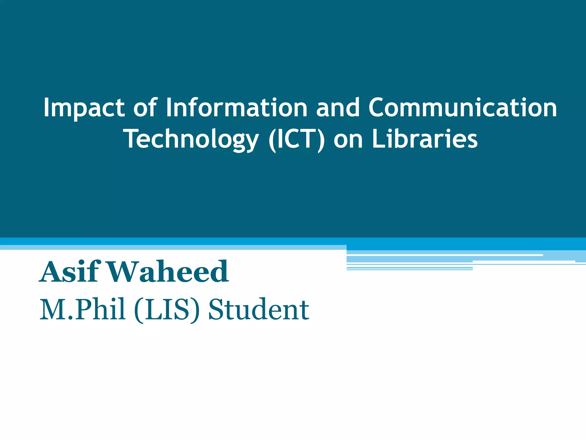 This document discusses the impact of information and communication technology (ICT) on libraries. It defines ICT as technologies used to communicate and disseminate information. The main ICT components in libraries are computer technology, communication technology, and reproduction technology. ICT allows libraries to automate functions like cataloging, circulation, and reference services. It also enables new user services like remote access to online catalogs and databases. Overall, ICT has transformed libraries by improving access, services, and operations.