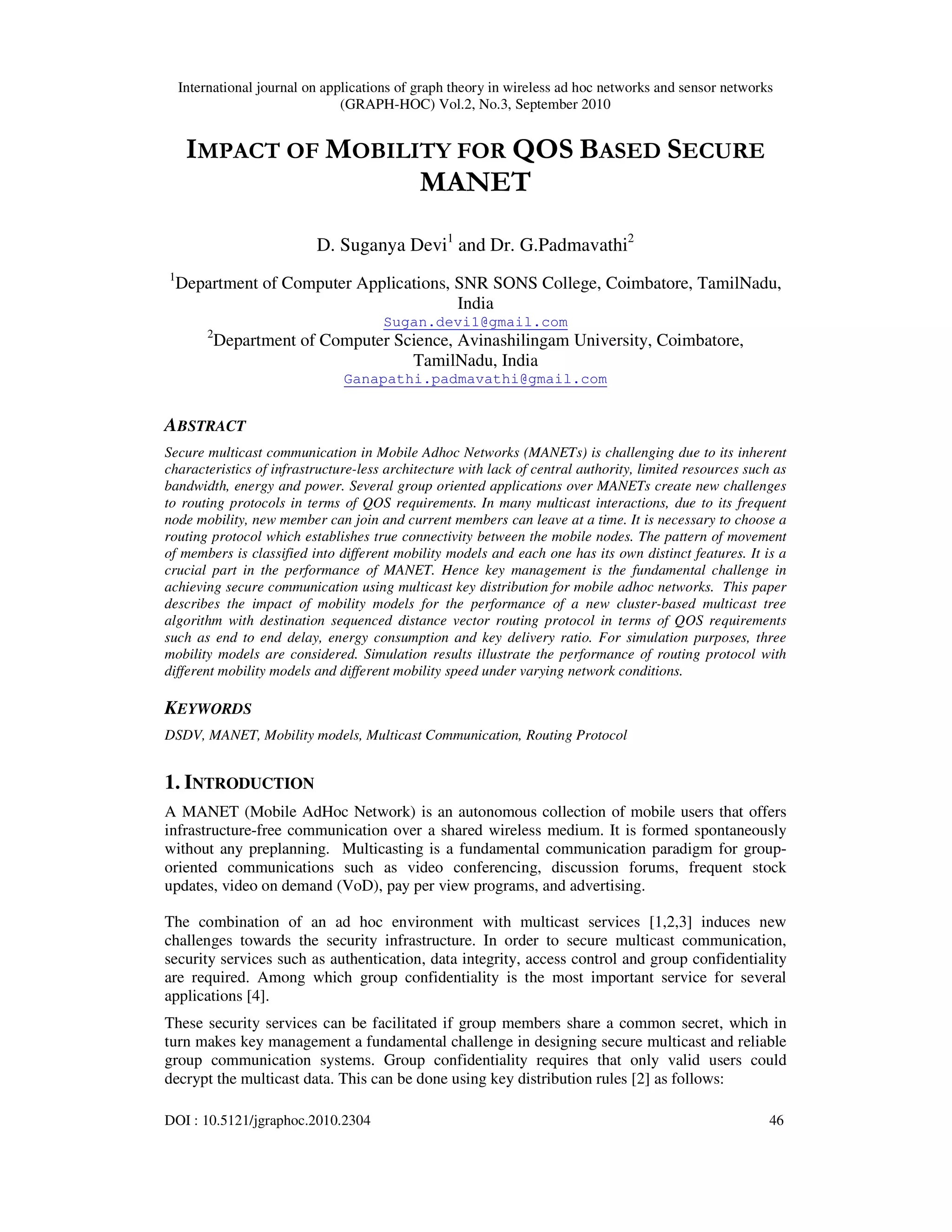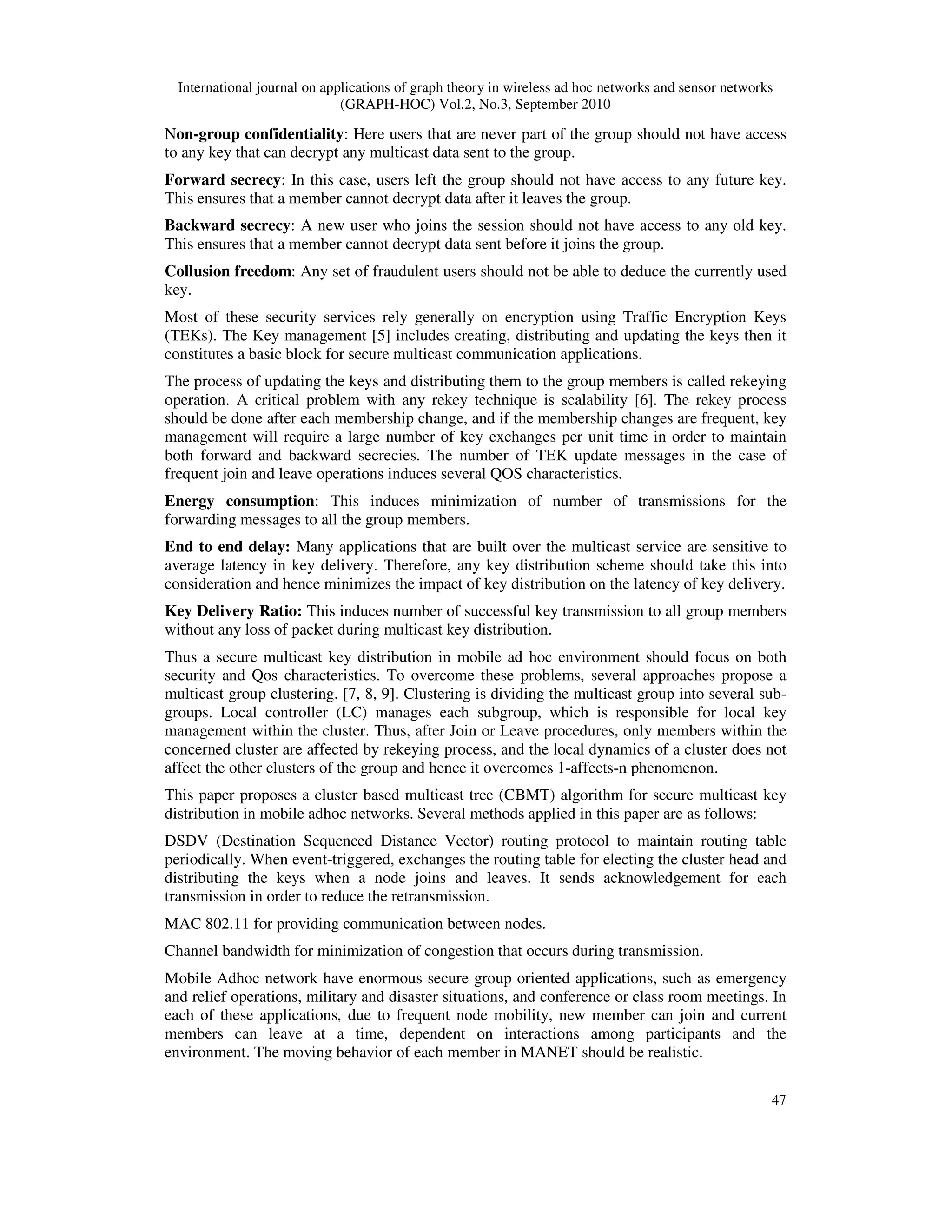 The document explores the challenges of secure multicast communication in mobile ad hoc networks (MANETs) due to intrinsic characteristics like node mobility and limited resources. It proposes a cluster-based multicast tree (CBMT) algorithm utilizing the Destination-Sequenced Distance Vector (DSDV) routing protocol to enhance performance on QoS requirements such as end-to-end delay and key delivery ratio under different mobility models. The study emphasizes the importance of effective key management and addresses the impacts of various mobility patterns on secure multicast key distribution in dynamic network environments.
