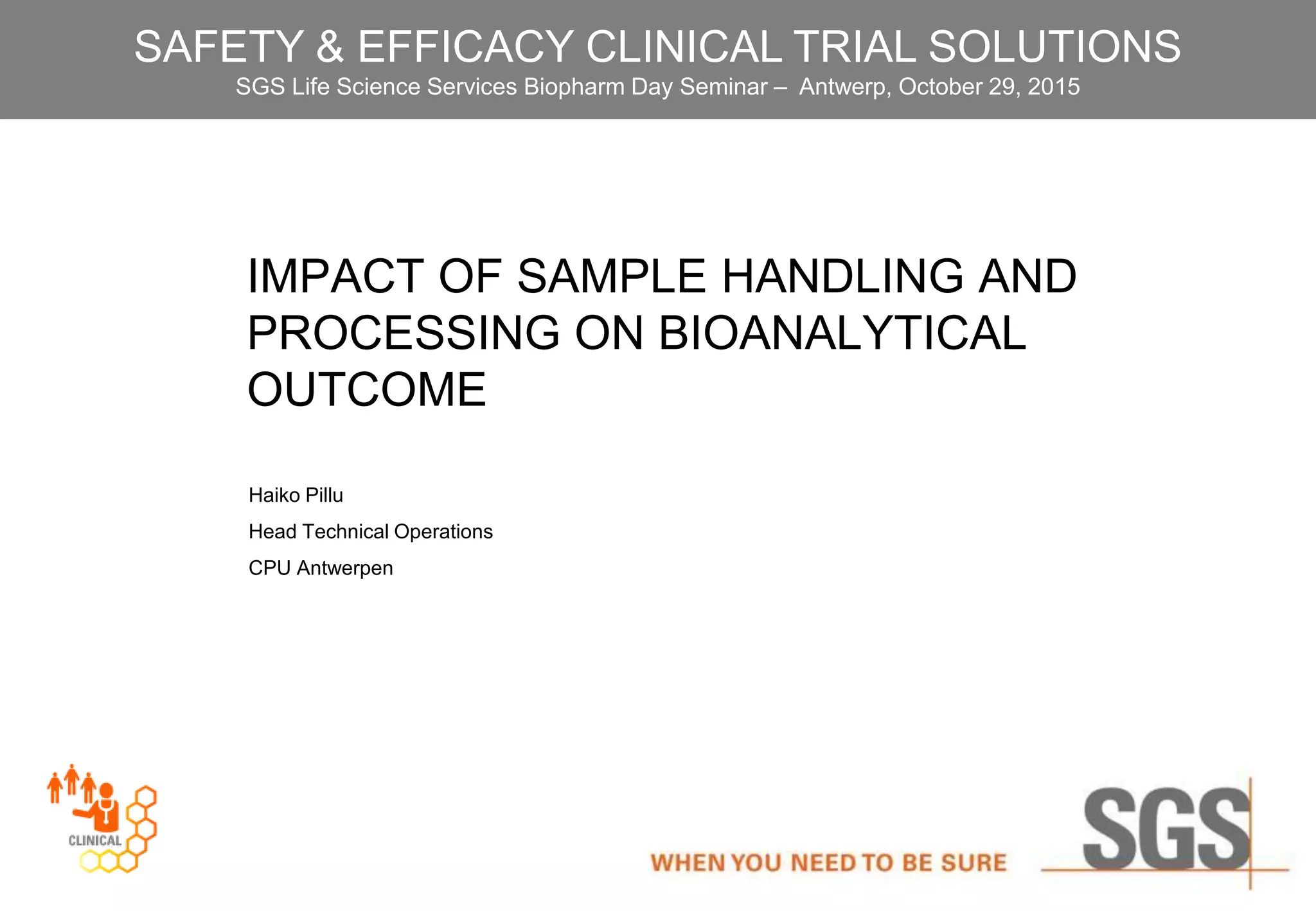 The document discusses the impact of sample handling and processing on bioanalytical outcomes in clinical trials, emphasizing that proper measures from sample collection to laboratory testing are essential due to the complexity and resource demands involved. It highlights the importance of validating techniques and implementing appropriate sampling conditions to ensure accurate results. Moreover, it underscores the need for effective communication and training between bioanalytical labs and clinical sites to avoid pitfalls in the process.
