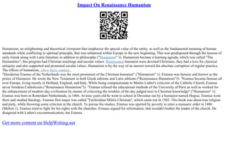 During the Renaissance period in Europe, the intellectual movement of humanism had a profound impact on education, art, and culture. Humanism emphasized the study of classical Greek and Latin literature, which led to new perspectives that elevated the status of individual humans and their potential. A key figure was Desiderius Eramus, a Christian humanist who wrote the New Testament in both Greek and Latin and criticized the Catholic Church while remaining within it. Humanism influenced Renaissance art by encouraging realistic depictions of humans and their experiences over purely religious subjects. It also changed education by introducing new subjects beyond theology. Overall, Renaissance humanism had wide-ranging effects and helped transform European civilization.