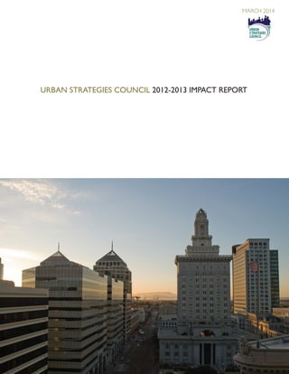 The Urban Strategies Council's 2012-2013 impact report highlights its efforts to combat persistent poverty through research, collaboration, and advocacy in the Bay Area. Key achievements include significant policy victories, data-driven initiatives, and the development of strategic programs aimed at educational and economic equity for underserved communities. The report emphasizes the importance of collective action and data in driving social change and outlines future directions to enhance community engagement and impact.
