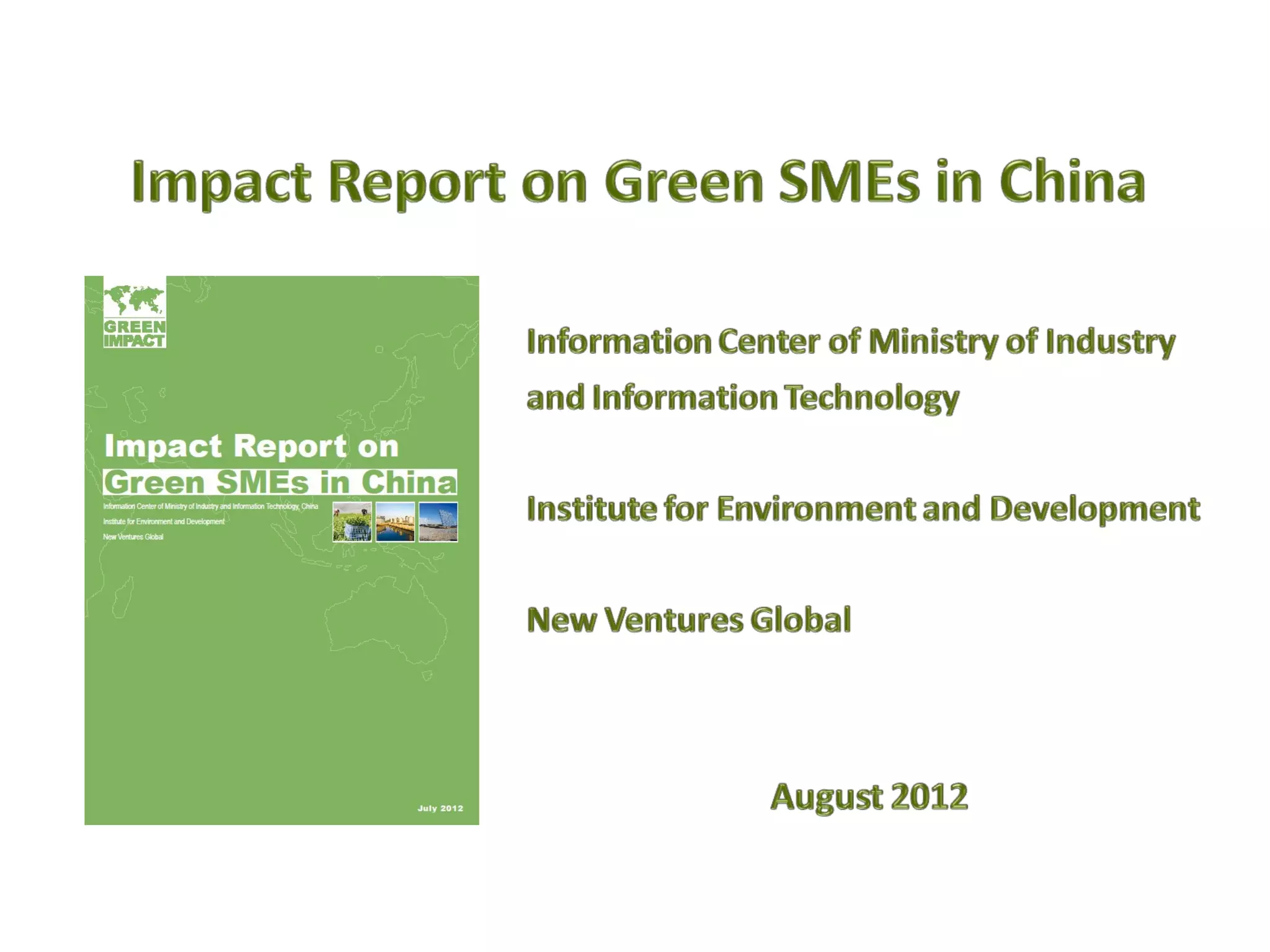 The document discusses the development and performance of green SMEs in China, highlighting their potential in environmental entrepreneurship since 2003. It outlines the status quo, impact performance indicators, and economic and environmental contributions of these enterprises, alongside key findings and next steps for further development. The report emphasizes the role of government policies, financing challenges, and the significance of innovative technologies in driving growth within the green sector.