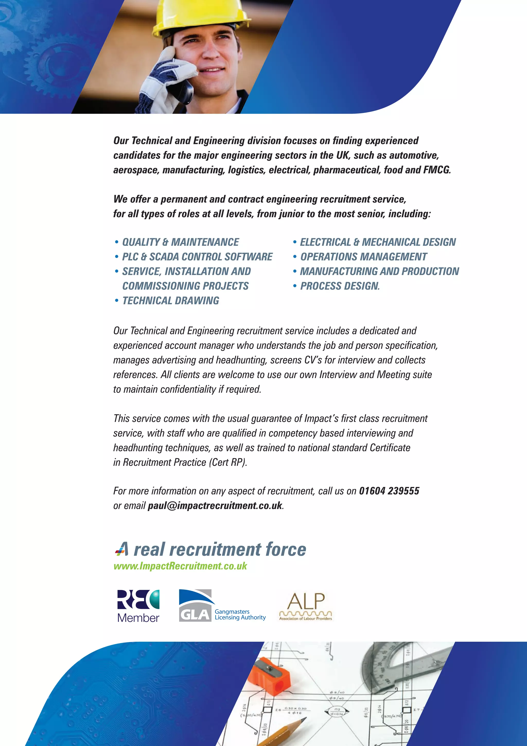 The Technical and Engineering division of Impact Recruitment focuses on finding experienced candidates for major engineering sectors such as automotive, aerospace, manufacturing, and logistics. They offer permanent and contract recruitment services for roles at all levels, including quality and maintenance, electrical and mechanical design, and operations management. Their recruitment process includes an experienced account manager who handles advertising, screening, interviewing, and referencing to provide a first-class recruitment service.