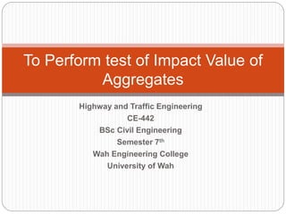 This document describes the procedure to test the impact value of aggregates according to ASTM C125. The test involves compacting a sample of aggregates passing a 14mm sieve and retained on a 10mm sieve in a cup. The cup is dropped 15 times from a height, after which the material passing a 2.36mm sieve is weighed. The impact value is calculated as the percentage of material passing the 2.36mm sieve relative to the total sample weight. A value between 10-20% is considered very strong and suitable for use in concrete and road construction. The results of testing three samples are reported, with an average impact value of 13.42% indicating very strong aggregates.