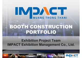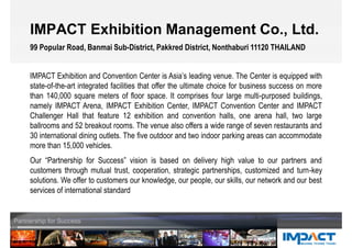 IMPACT Exhibition Management Co. is a leading exhibition and convention center in Asia with over 140,000 square meters of space. It consists of four multi-purpose buildings that can host various events. IMPACT aims to provide high value partnerships and customized solutions to clients. It offers a range of event management services including market research, promotions, operations, and on-site logistics. IMPACT works with international and local organizers to create effective market platforms and business matching programs through professional exhibition, conference, and seminar services.