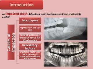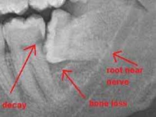 A 65-year-old patient presented with a chronic infection related to an impacted lower third molar. Despite recommendations for removal, the patient refused treatment, resulting in progression of the deep bone infection and a pathologic fracture of the jaw. Factors such as age, medical comorbidities, proximity to adjacent structures, and risk of damage during surgery are considered when determining if an impacted third molar should be removed. Surgical extraction involves raising flaps, removing bone, dividing and extracting the tooth, and closing the wound. Postoperative care may include antibiotics, analgesics, and steroids. Complications can be intraoperative such as nerve injury, fracture, or bleeding, or postoperative like pain, swelling, and infection.