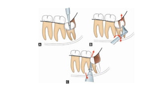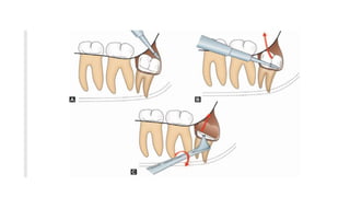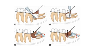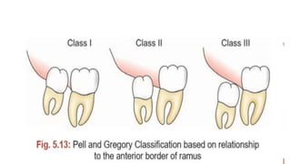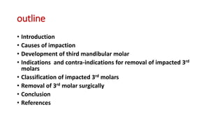 The document discusses the causes, development, classification, and surgical removal of impacted mandibular third molars. It includes information on indications and contraindications for their removal, as well as perioperative and postoperative management. Key considerations include the frequency of impaction, reasons for extraction, surgical techniques, and the importance of professional judgment in the decision-making process.