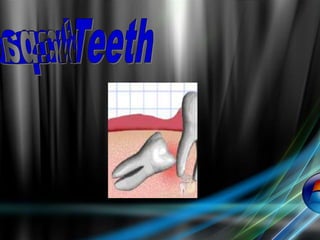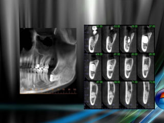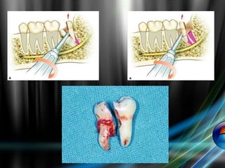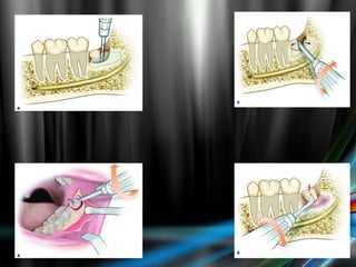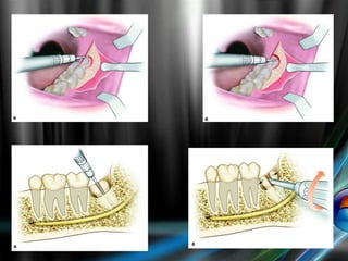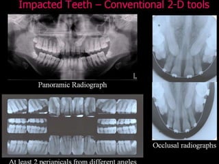 This document discusses impacted teeth, including definitions, causes, classifications, frequencies, indications for removal, complications, diagnosis, surgical techniques, and postoperative care. It defines an impacted tooth as one that fails to erupt into its normal position and lists both systemic and local causes. It describes several classification systems for impacted third molars and cuspids based on their position, depth of impaction, and relationship to surrounding structures. Common indications for removing impacted teeth include pain, dental caries, periodontal disease, pericoronitis, and cysts or tumors. The document outlines the steps for surgically removing impacted teeth and managing postoperative complications.