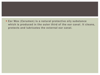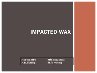 Impacted earwax occurs when earwax becomes compressed in the ear canal, blocking it. This can cause symptoms like ear pain, fullness, and hearing loss. People more prone to impacted earwax include those with hairy ear canals, who work in dusty environments, the elderly, and hearing aid users. Impacted earwax is typically treated first with ear drops to soften the wax, and then removal either on its own or with irrigation. Nursing care involves examining the ears, assessing any impaction, educating on prevention of insertion of objects in the ear, and examining high-risk groups like the elderly.