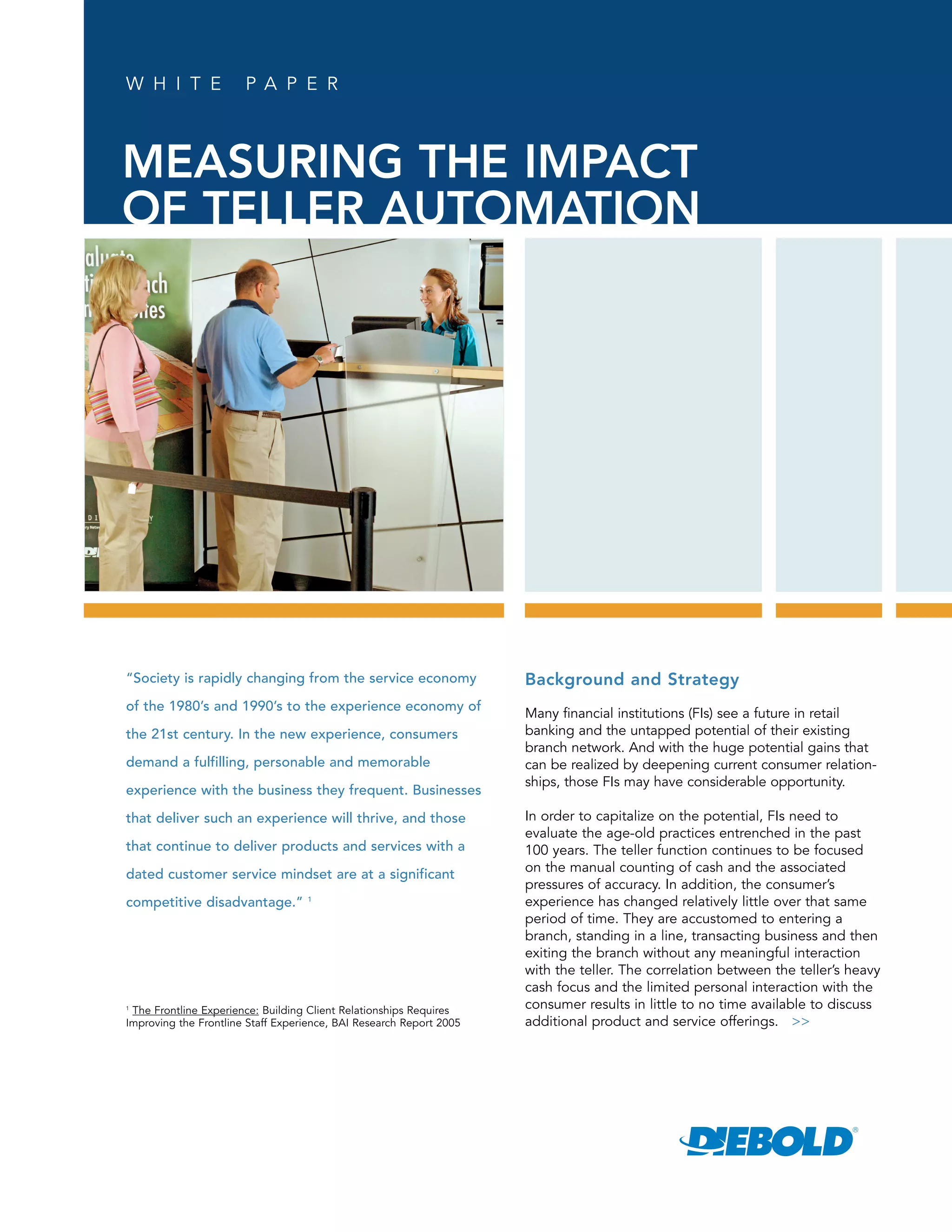 The document discusses measuring the impact of teller automation in financial institutions. It notes that as the economy has shifted to prioritizing experiences over products, businesses must deliver memorable customer experiences. The document then outlines how tellers currently spend significant time on manual cash handling tasks, leaving little time for customer interactions. It also identifies five key areas of inefficiency in branch operations related to cash handling. Teller automation aims to streamline cash transactions and reallocate teller time and focus to strategic goals like deepening customer relationships and cross-selling. Financial institutions implement teller automation to reduce wait times, lower costs through reduced staff needs, transform tellers to a more consultative role, and increase security by eliminating cash in drawers.