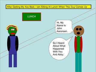 John Aaronson approaches Dwight Scott at lunch to warn him about getting involved in fights and standing up for others. He explains that doing so will make Dwight a target for bullies and could endanger his life. John advises Dwight that while standing up against injustice is important, he should be smarter about it and avoid building a reputation as a vigilante. John also reveals that the girl Dwight defended, Abby Grace, is actually very tough and skilled in martial arts, so she doesn't need his help. He tells Dwight it's best sometimes to just be a good person yourself rather than confronting others.