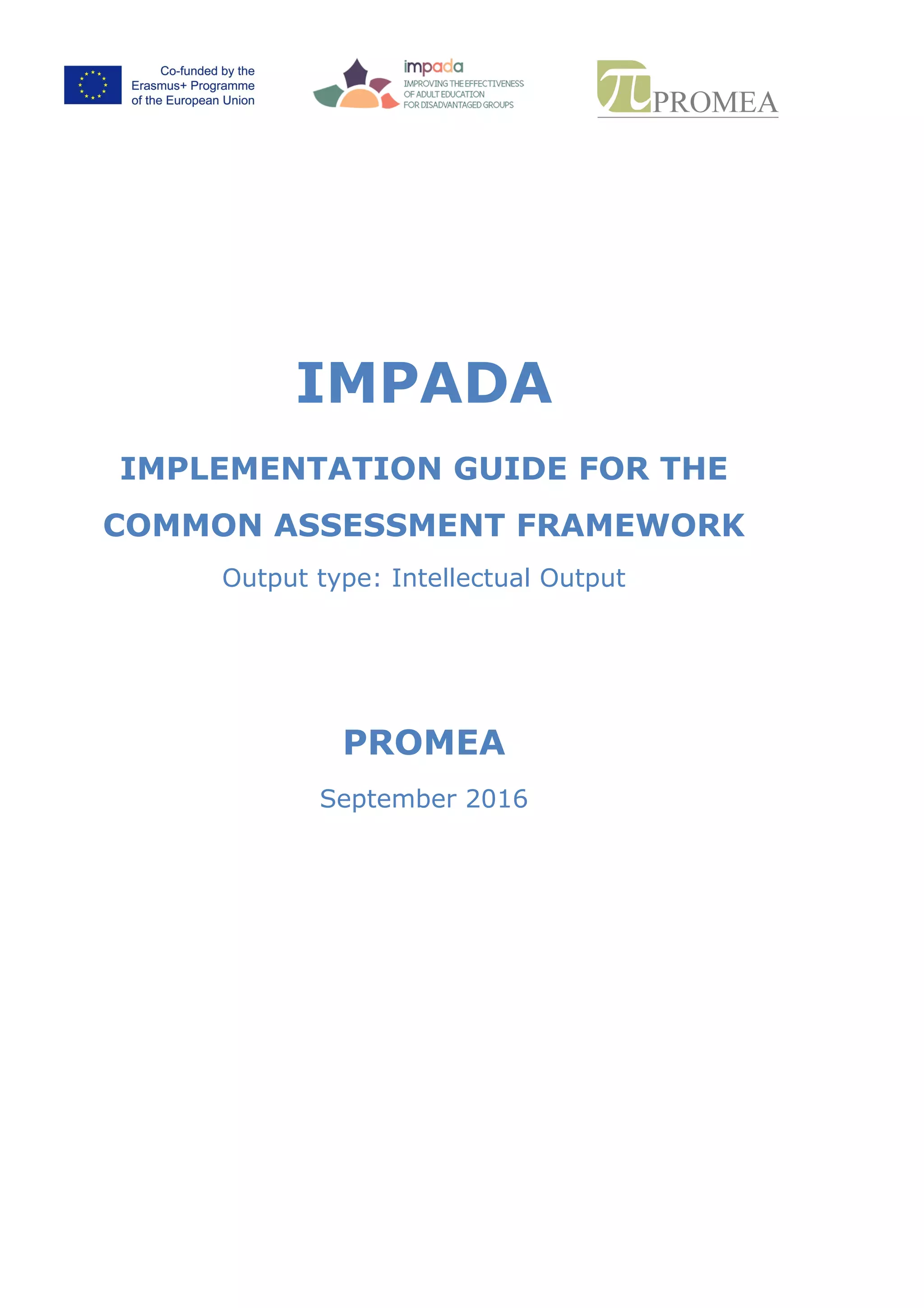 The IMPADA Implementation Guide provides a structured approach for education organizations to engage in self-assessment of their adult education programs for disadvantaged groups. It outlines a four-stage process including understanding the CAF structure, establishing a self-assessment team, completing the assessment, and planning for improvements, facilitated by specific methodologies and success indicators. The guide emphasizes continuous improvement and includes country-specific provisions relevant to the partners involved.