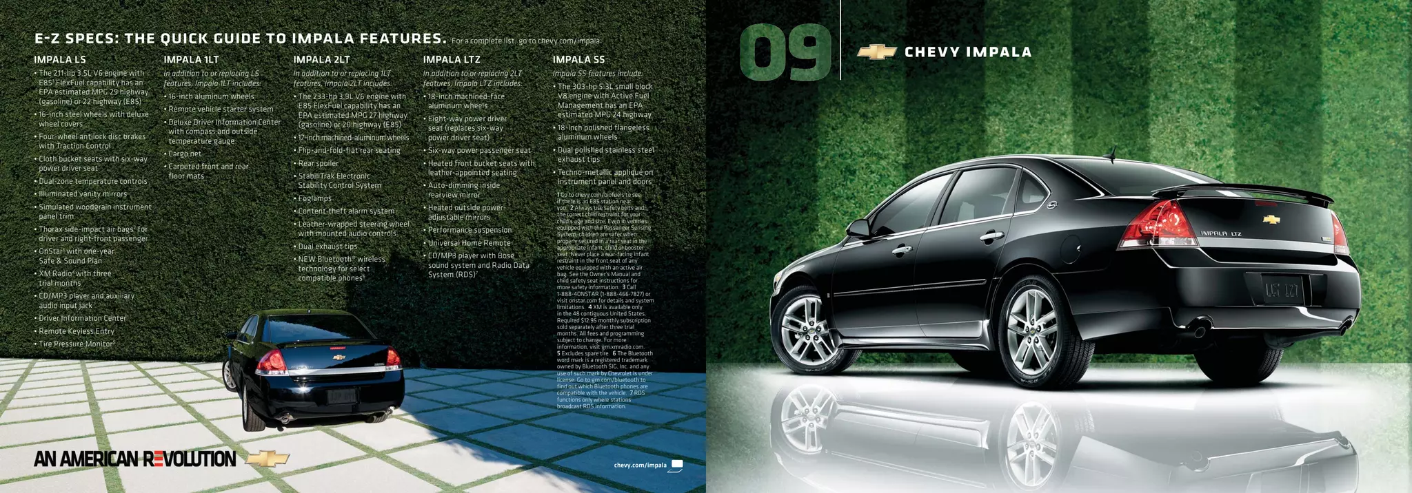 The document provides details on the different trim levels of the Chevrolet Impala. It lists the standard and available features for each trim level, from the base LS model up to the high-performance SS. Some highlights include the 3.5L V6 engine offered in lower trims with E85 flex-fuel capability. Higher trims add more luxury and convenience features such as leather seats, navigation, and hands-free Bluetooth. Safety features like airbags and stability control are standard across all trims. The Impala comes with a 100,000 mile powertrain warranty and roadside assistance package.