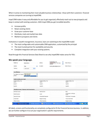 ImpelCRM offers a customizable customer relationship management solution tailored for the financial services industry, enabling companies to enhance organization, maintain customer engagement, and boost profitability. Key features include lead management, integrated marketing campaigns, loan processing tracking, and client management tools, all designed to fit the specific needs of financial institutions. By using ImpelCRM, businesses can streamline their operations and improve customer interactions effectively.