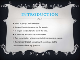 This document provides instructions for a group project on imperative sentences in English. It outlines that the group will have four members who will each take on a designated role. They are to answer questions about imperatives using provided online resources and contribute their answers to constructing an overall question. The questions cover the definition and uses of imperatives, including with do and vocatives. The group is then to support with examples whether imperatives are used in life.