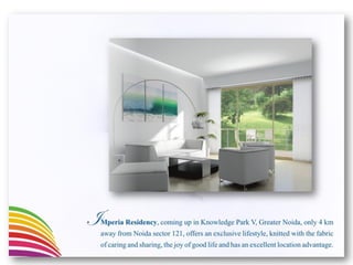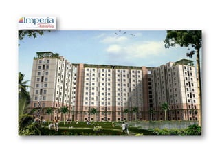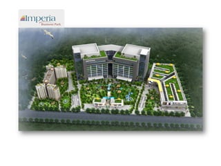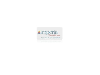 This document summarizes a real estate development project called Imperia Business Park located in Greater Noida, India. The development will include commercial and residential spaces across 21 acres. It will feature world-class amenities and be located near major transportation corridors for convenience. Floor plans and pricing are provided for furnished 1BHK and 2BHK units, with payment plans and additional charges also outlined. The development aims to transform the urban landscape and provide high quality spaces and services for customers.