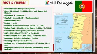 1. It outlines key facts and figures about Portugal such as its size, population, capital, government, GDP, economy, currency, and religion.