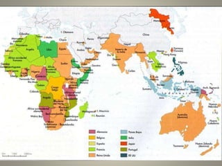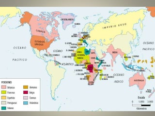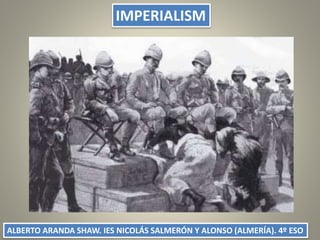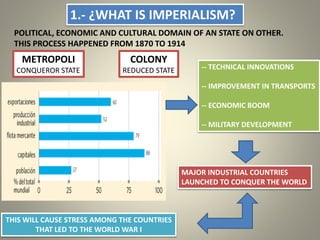 The document discusses imperialism from 1870 to 1914, defining it as the political, economic, and cultural domination of one state over another. It covers the causes of imperialism, including demographic, economic, political, scientific, and ideological factors, and details the major colonial empires such as the British, French, and German empires. Additionally, it addresses the consequences of imperialism, which include demographic shifts, economic exploitation, social stratification, cultural loss, and geopolitical changes.