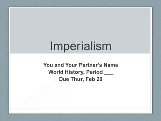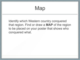 This document provides instructions for creating a poster on imperialism. It outlines sections to include on the poster such as a map identifying conquered regions and western conquering countries, a timeline of conquest, and perspectives from both the native and imperialist sides. For each perspective, it lists questions to research and include on the poster, such as how natives lived under colonial rule and resistance movements, and reasons for colonization from the imperialist viewpoint. Students are also directed to include at least two pictures on each side of the poster related to the topic.