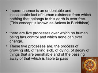 The document discusses the concept of impermanence, highlighting it as a fundamental aspect of human existence according to Buddhism and Hinduism. It emphasizes that life is continuously changing, and our attachments, especially to the self and ego, hinder our understanding of this truth. Through meditation and mindfulness, individuals can cultivate an awareness of impermanence, leading to liberation and deeper peace.