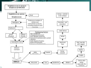 Impetigo is a highly contagious superficial skin infection primarily affecting children, caused by Staphylococcus aureus and Streptococcus pyogenes. It manifests as blisters, which can become crusted, and is common in warm, humid conditions, with significant prevalence in low-income areas, affecting over 162 million children globally. Treatment involves topical antibiotics like mupirocin for mild cases or oral antibiotics for more severe infections, with preventive measures emphasizing hygiene to avoid spreading the condition.