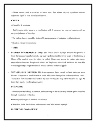 Impetigo is a highly contagious skin infection affecting the superficial layers of the epidermis, primarily caused by Staphylococcus aureus and Streptococcus pyogenes. It manifests in two forms: bullous impetigo with blisters and non-bullous impetigo with crusted sores, often occurring in children, especially in tropical climates. While it can resolve on its own, treatment with antibiotics is recommended to prevent complications and promote healing.