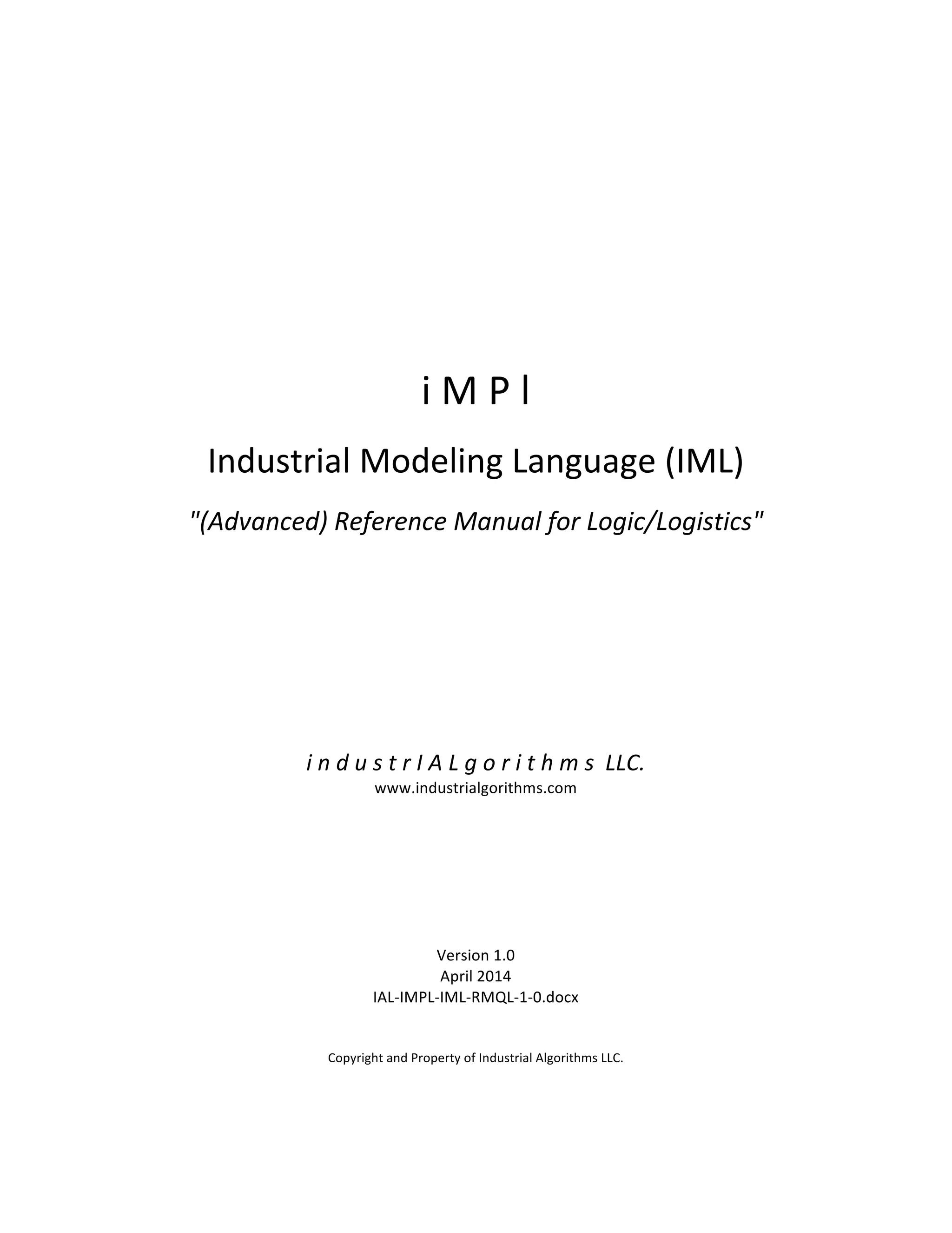 The document is an advanced reference manual for the Industrial Modeling Language (IML) used for configuring and solving complex industrial optimization problems. It outlines the necessary configuration data for logic and logistics variables, detailing constraints, cost data, and timing configurations for industrial operations. Additionally, it includes a demo of a job-shop scheduling optimization problem to illustrate application concepts.