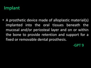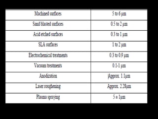 The document discusses various aspects of implant design and surface modifications. It describes different types of implant designs including endosteal, subperiosteal, and transosteal implants. Key factors in implant design discussed include length, diameter, geometry, and surface characteristics. Surface modifications aim to increase roughness and bioactivity through techniques like sandblasting, acid etching, and anodization. The goal is to enhance osteoblast adhesion and bone integration through both macroscale and microscale surface modifications.