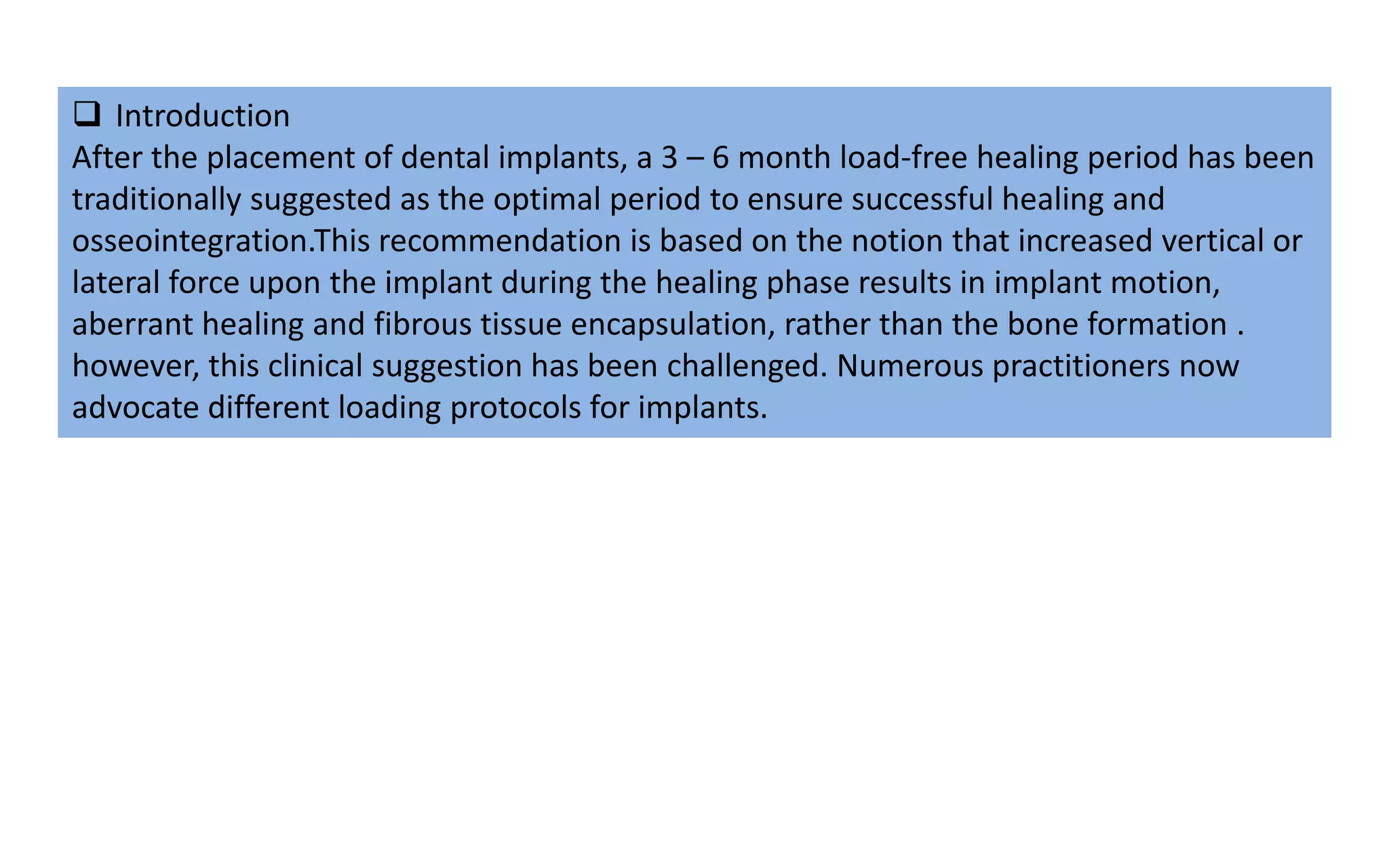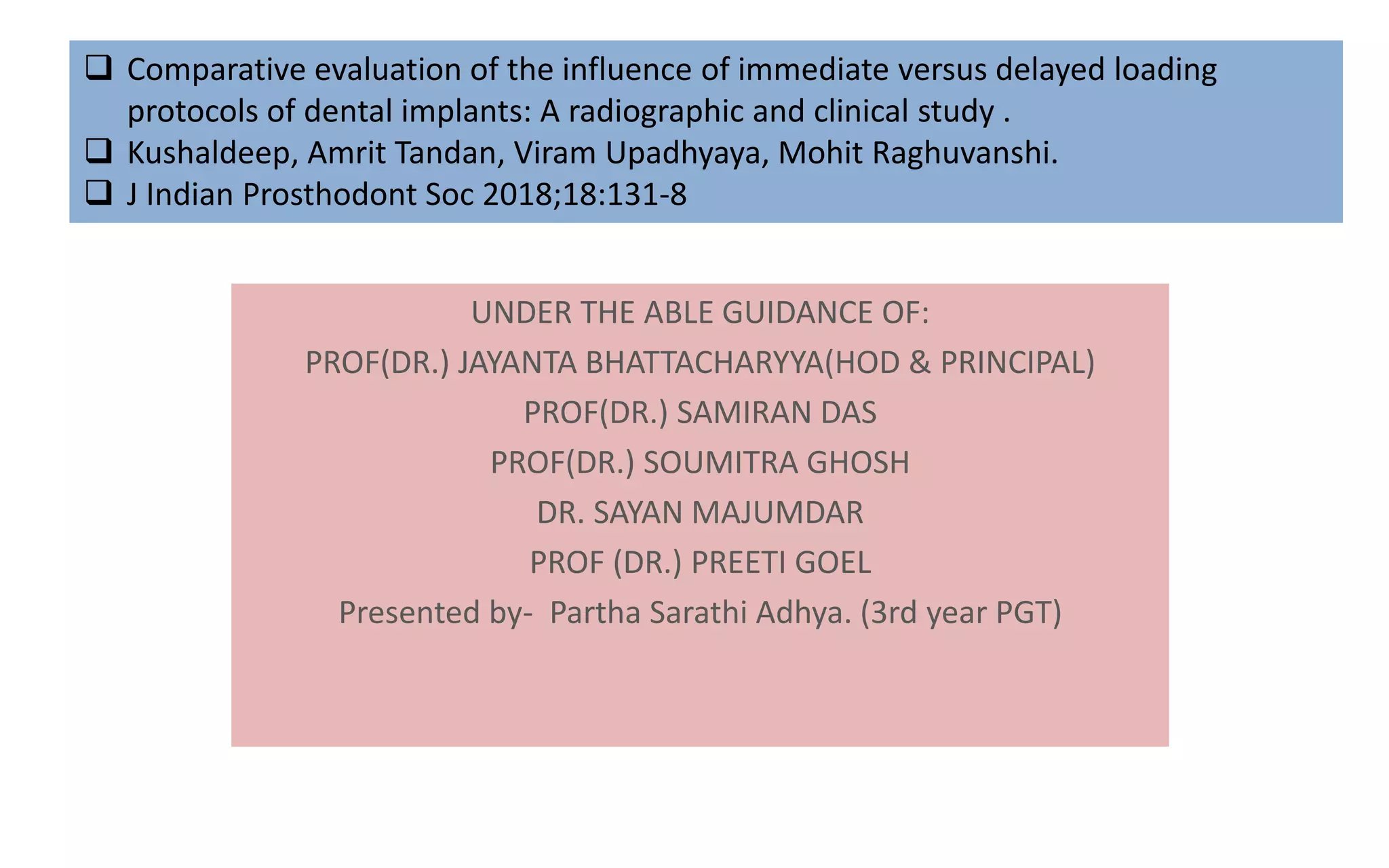 The document presents a comparative study on immediate versus delayed loading protocols of dental implants, highlighting factors affecting osseointegration and clinical outcomes. It discusses different loading conditions and their implications on bone loss and healing, concluding no statistically significant difference in crestal bone loss between the two methods. The study emphasizes the importance of implant stability and individual patient factors in determining the appropriate loading protocol.