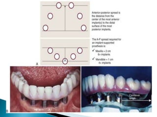 2) Treatment planning considerations include implant placement based on available bone, with a minimum of 3 implants to replace missing posterior teeth in the maxilla.