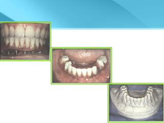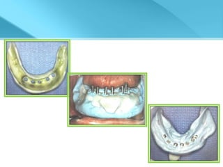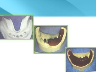 This document provides an overview of implant supported overdentures, including definitions, history, indications, contraindications, advantages, disadvantages, treatment options, and procedures. Key points discussed include: