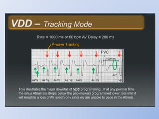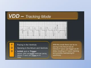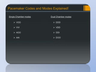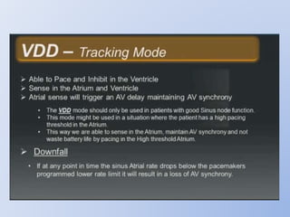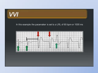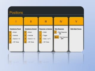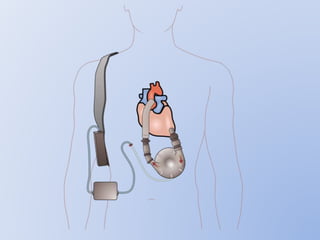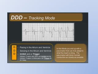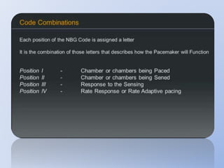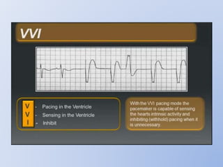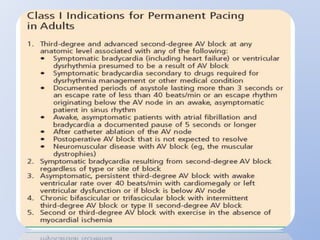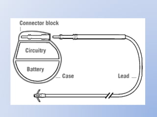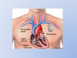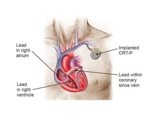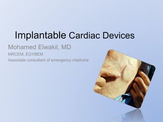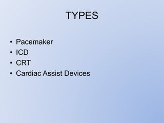 This document discusses various implantable cardiac devices including pacemakers, implantable cardioverter-defibrillators (ICDs), cardiac resynchronization therapy (CRT), and cardiac assist devices. It describes the components, indications, and complications of pacemakers and ICDs. It also covers topics such as pacemaker/ICD terminology, programming, interactions with defibrillation, and transcutaneous pacing. Cardiac assist devices are briefly discussed, noting examples like LVADs, BiVADs, and total artificial hearts.