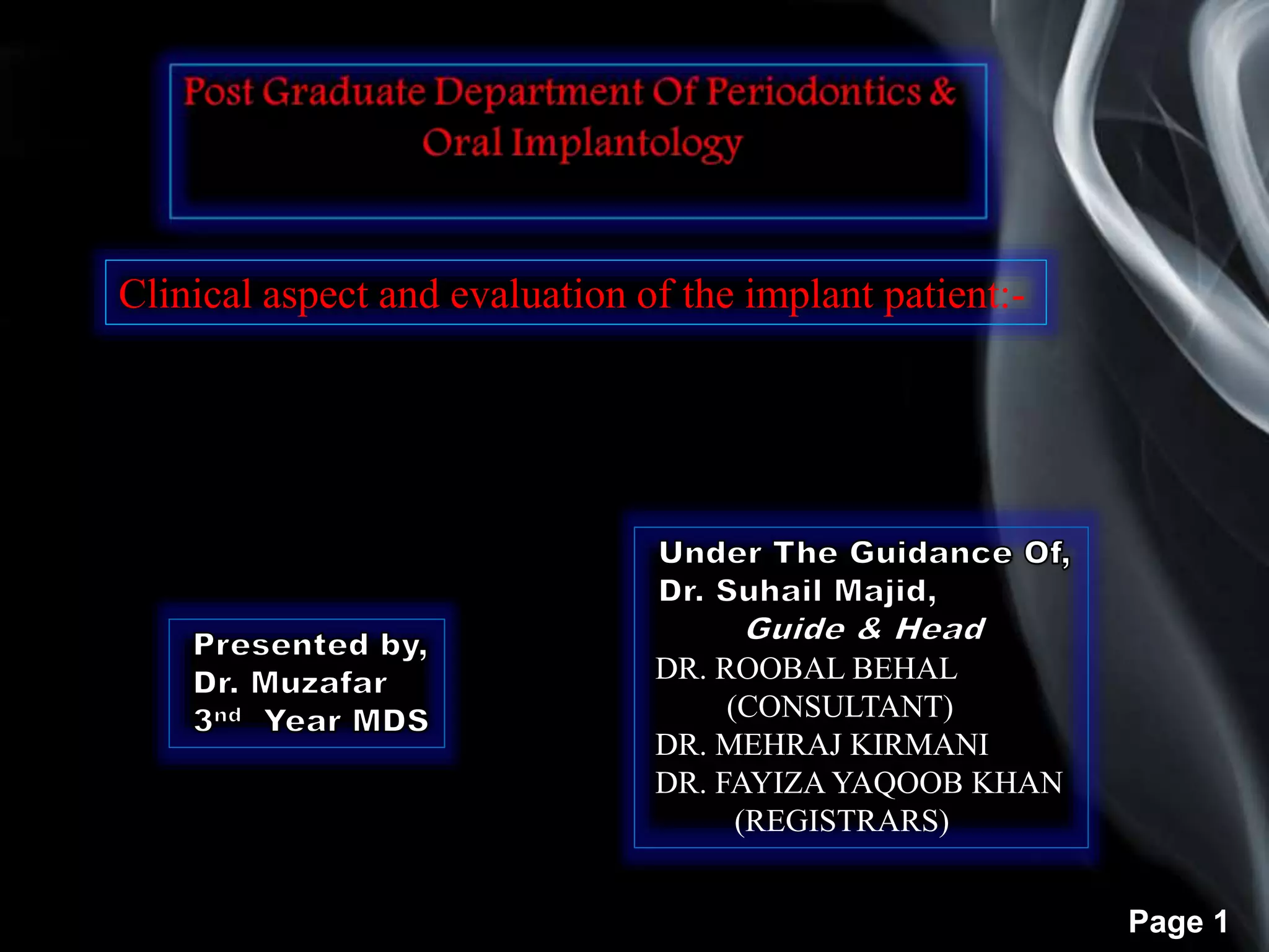 This document discusses the clinical evaluation of dental implant patients. It covers topics such as definitions of dental implants, classifications of implants, components of implants, and pretreatment evaluation of potential implant patients. The pretreatment evaluation includes assessing medical history, dental history, local examination of bone and tissue quality, and determining if a patient's expectations are reasonable. Various classifications of available bone quality are provided, from abundant bone (Division A) to compromised bone (Division C), along with treatment options for each. The goal of the evaluation is to accurately diagnose a patient's current condition and determine if they are a suitable candidate for dental implants.