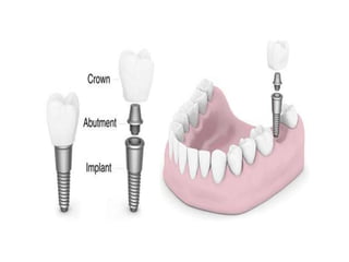 This document discusses different types of implants used in medicine. It begins by defining implants as artificial devices inserted into the body to replace or support damaged biological structures. Implants are categorized based on their application, with main groups being orthopaedic, dental, sensory/neurological, and cardiovascular implants. Orthopaedic implants discussed include screws, plates, and interlocking nails/rods used to treat bone fractures. Dental implants are also described as artificial tooth roots made of titanium that fuse with the jawbone. The document outlines reasons for using implants and concludes they provide long-term solutions when conditions allow for proper host tissue integration.