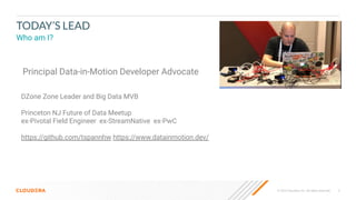 The document discusses the implementation of a universal data distribution architecture designed to manage streaming data across various environments, aimed at simplifying and accelerating data management for platform administrators, data architects, and app developers. It addresses challenges related to fragmented infrastructure, siloed data processing tools, and operational inefficiencies and proposes a streamlined solution utilizing low-code tools for data ingestion and processing. Key features include real-time data observability, integrated security, and support for both public and private cloud environments.