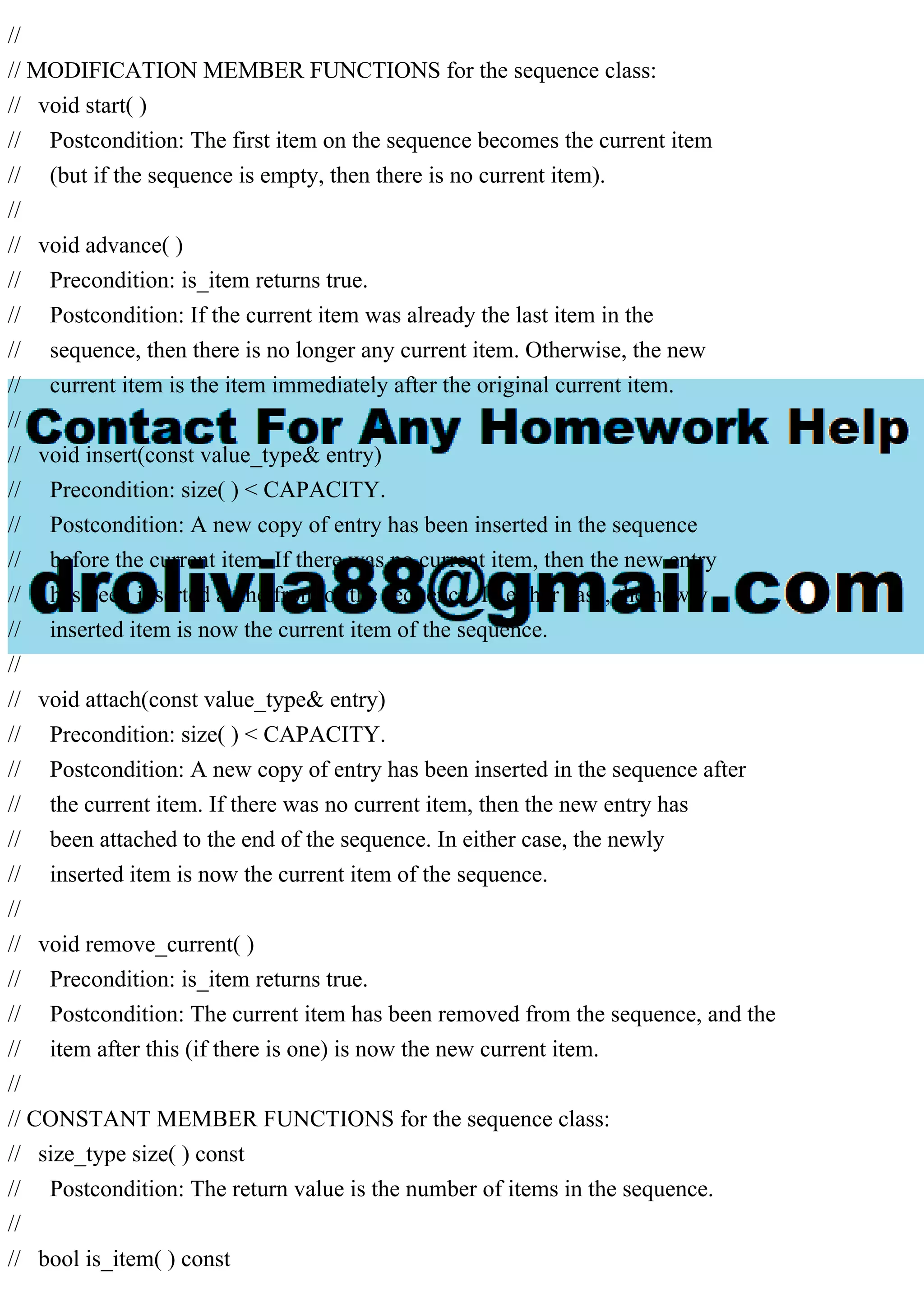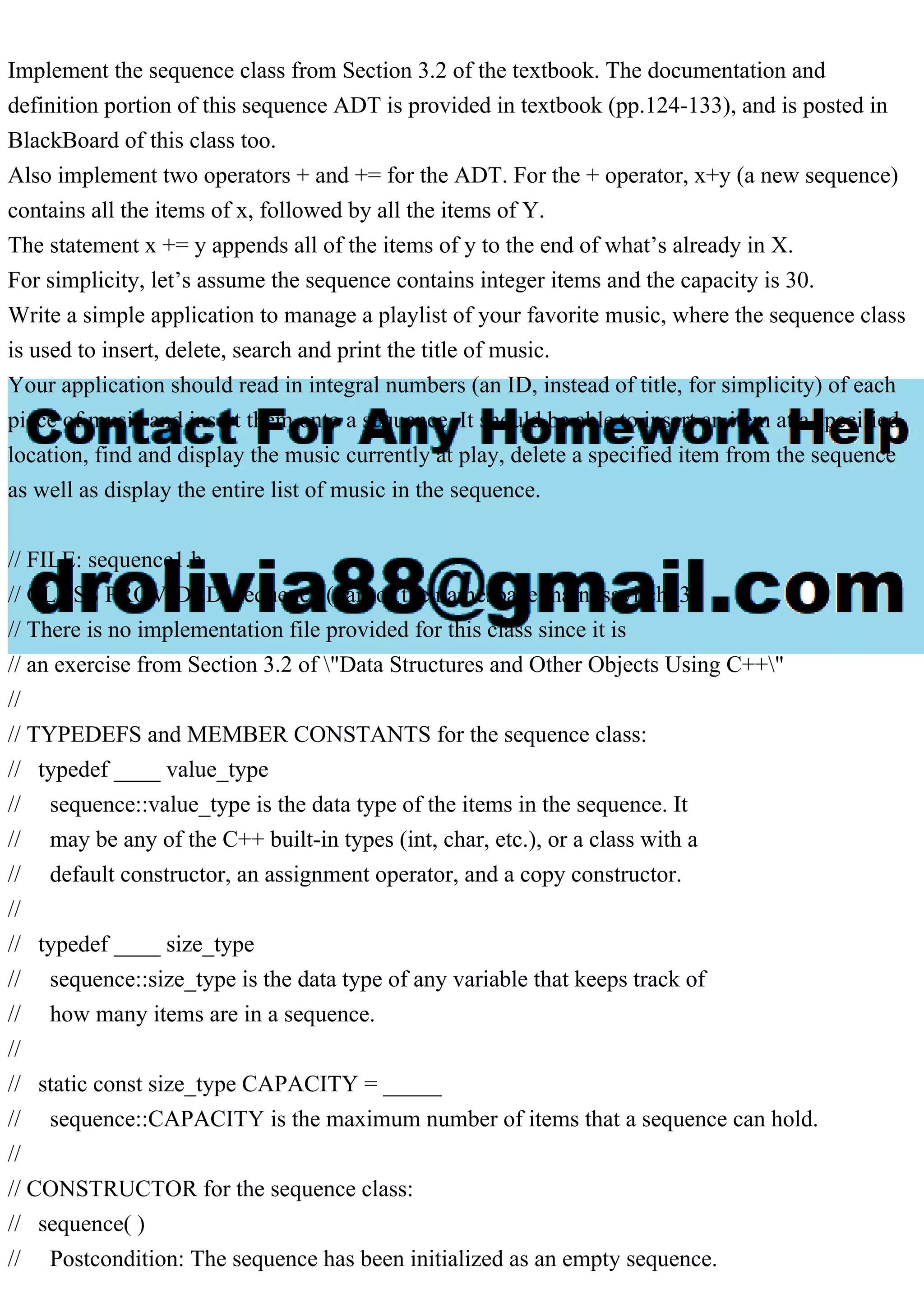 The document outlines the implementation of a sequence class in C++ as described in a textbook, including the addition of operators + and += to concatenate sequences. It details the functionalities required for managing a playlist, such as insertion, deletion, searching, and printing music titles using integer IDs. Additionally, extensive member functions and their respective operations for maintaining the sequence are provided.
