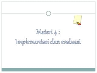 Dokumen ini menjelaskan tentang implementasi keperawatan sebagai tahap keempat dari proses keperawatan, yang mencakup pelaksanaan rencana intervensi untuk membantu pasien. Proses evaluasi penting untuk menilai efektivitas tindakan keperawatan, serta mengumpulkan data dan membuat kesimpulan sesuai kriteria yang ditetapkan. Selain itu, modifikasi asuhan keperawatan dibahas untuk mengatasi berbagai masalah kesehatan yang teridentifikasi.