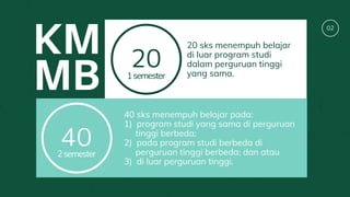 Dokumen ini membahas tentang implementasi program Kampus Merdeka-Merdeka Belajar pada Program Studi Teknologi Pendidikan di seluruh Indonesia. Program ini memberikan kesempatan kepada mahasiswa untuk mengambil mata kuliah sebanyak 20 sks di luar program studinya, baik di perguruan tinggi yang sama ataupun berbeda, atau bahkan di luar perguruan tinggi. Dokumen ini juga membahas kerja sama antar program studi Teknologi Pendidikan