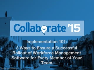The document outlines a strategy for successfully implementing workforce management software, focusing on three key elements: engaging stakeholders, effective communication, and monitoring progress. It emphasizes the importance of collaboration, feedback, and celebrating milestones throughout the implementation process. The timeline details the rollout phases from November 2014 to March 2015, highlighting tasks such as training, testing, and stakeholder involvement.