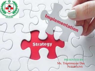 This document provides an outline and details on the nursing process step of implementation. It begins with defining a nursing intervention as any treatment performed by a nurse based on clinical judgment and knowledge. The purposes of implementation include standardizing nursing language, developing information systems, and determining costs of nursing services. The process of implementation involves reassessing clients, determining if assistance is needed, performing interventions, supervising delegated care, and documenting activities. Major nursing responsibilities in implementing care include reviewing plans, scheduling care, collaborating with others, supervising delegation, achieving goals, providing direct care, counseling, teaching, and making referrals. Examples provided illustrate implementing care for pneumonia and a urinary tract infection.