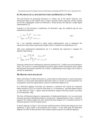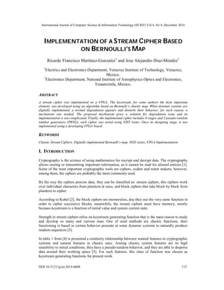 This document discusses the implementation of a stream cipher based on Bernoulli's map, using an FPGA for generating a keystream through pseudo-random number generators (PRNG). It addresses degradation issues in dynamically implemented chaotic systems and introduces a solution involving multiple stages for enhanced randomness. The proposed cipher was evaluated and confirmed to have good cryptographic properties through NIST statistical testing.