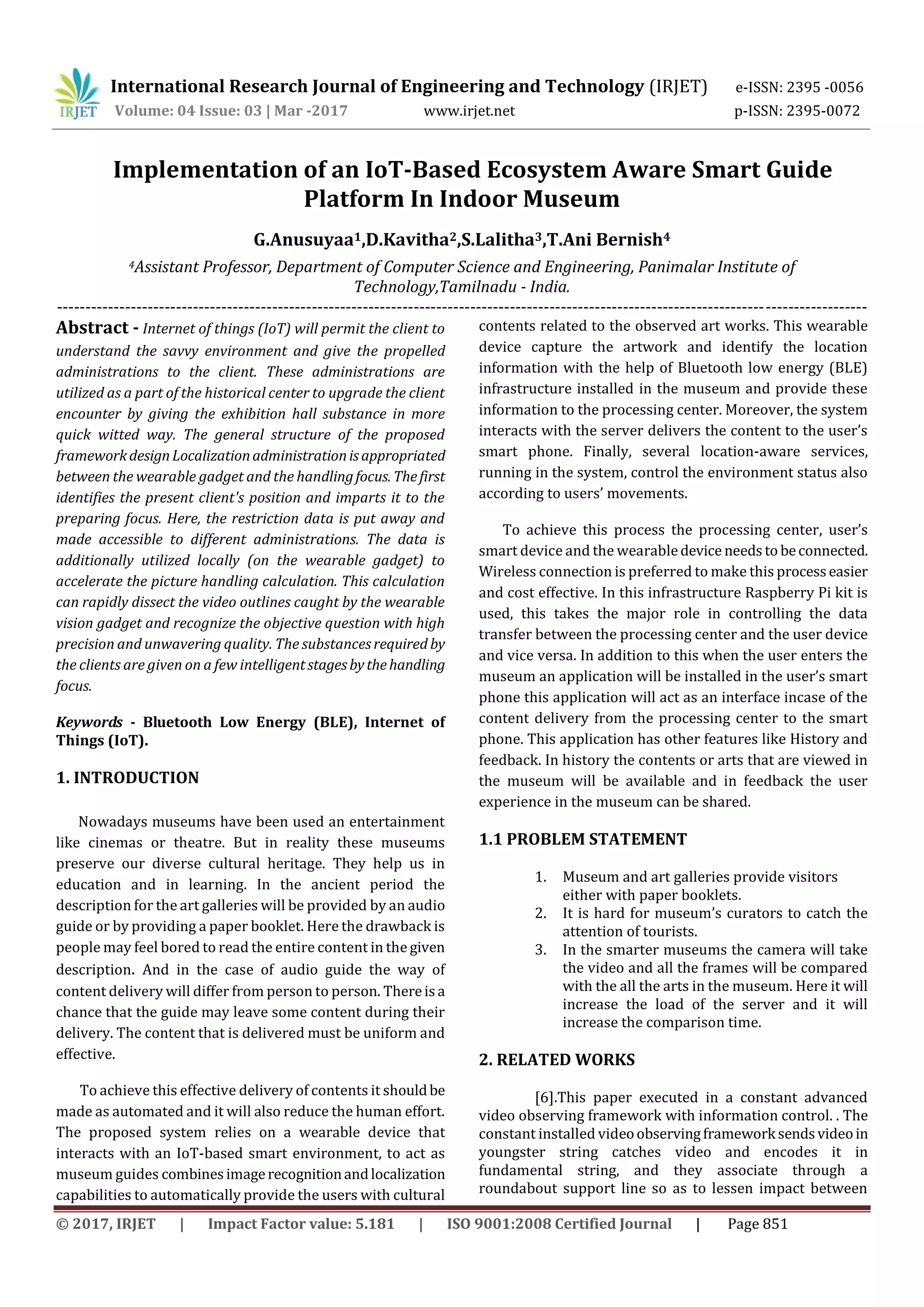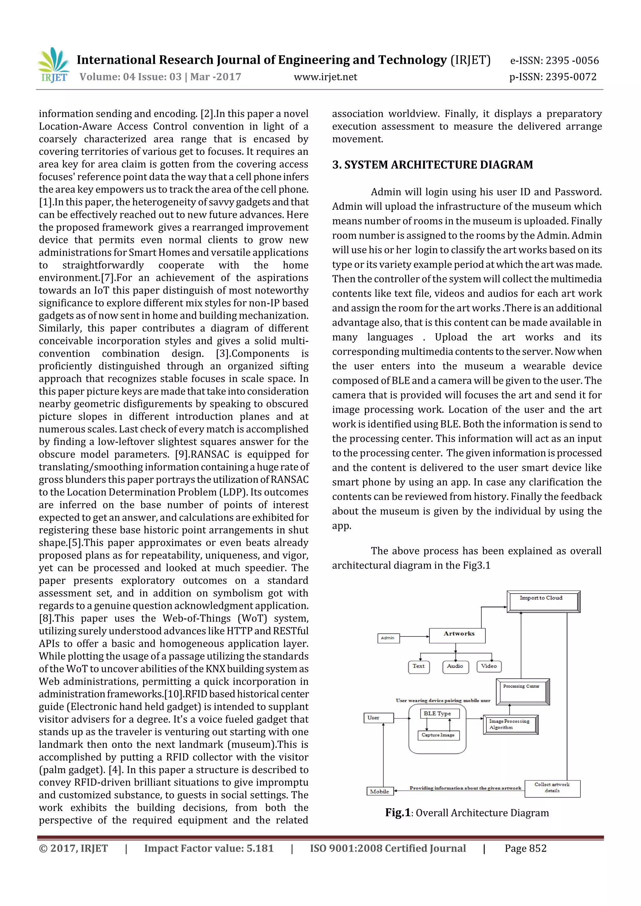 This document proposes an IoT-based smart guide platform for indoor museums to improve the visitor experience. The system uses a wearable device with a camera and Bluetooth Low Energy (BLE) to identify the user's location and capture images of artworks. This information is sent to a processing center along with the captured images. At the processing center, the images are analyzed to recognize the artwork and location data is used to retrieve multimedia content about the artwork from the server. The relevant content is then sent to the user's smartphone via an app. The system aims to automatically provide customized information to users as they view different artworks in the museum in order to deliver content in a more engaging way compared to traditional paper guides or audio guides.