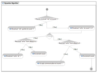 The document discusses the implementation of the Byzantine Fault Tolerant algorithm in wireless sensor networks, detailing the goals, constraints, and procedures for its execution on both mesh and multi-hop network configurations. It covers the technologies used, including simulations and practical demonstrations, as well as comparisons between different algorithms. Future improvements and a cloud computing extension for the simulator are also suggested.