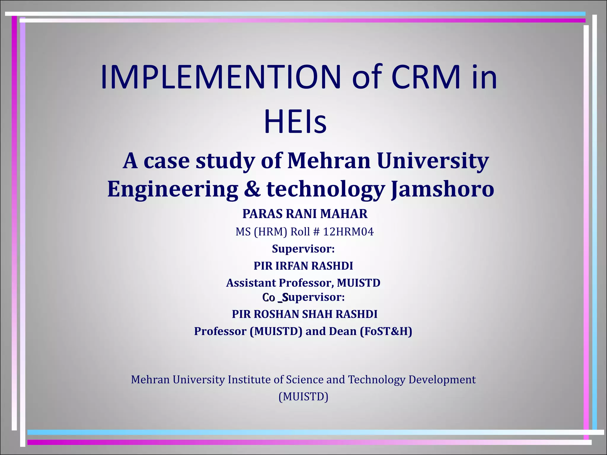 This document outlines a case study on implementing a customer relationship management (CRM) system at Mehran University of Engineering and Technology in Jamshoro, Pakistan. The study will explore CRM implementations in other universities, identify the need for CRM at Mehran University, and develop a model for implementing CRM. A mixed methodology will be used, collecting both primary and secondary data. The research is expected to contribute to the literature on CRM in higher education institutions and Pakistan by providing new implementation research and a beneficial model for universities.