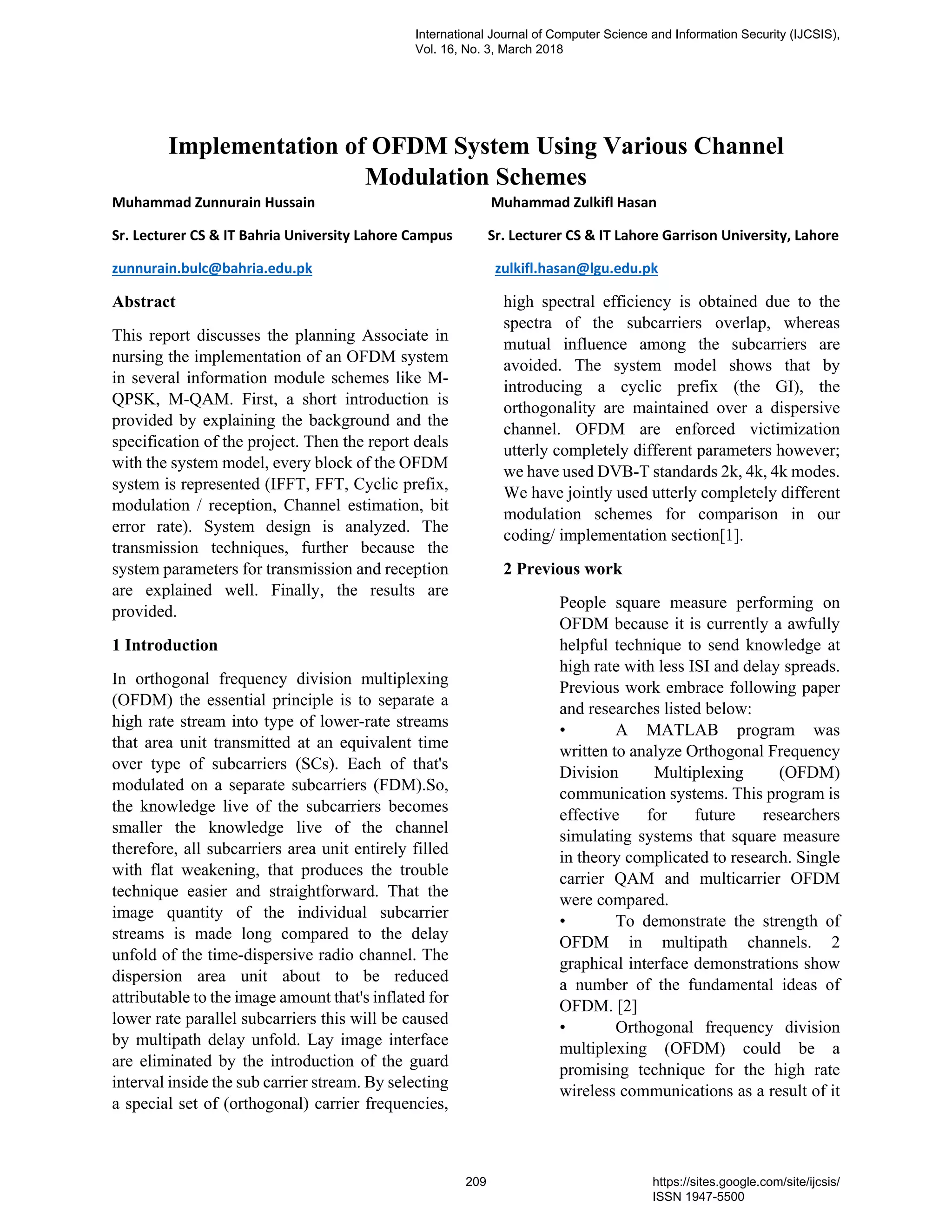 This report details the implementation of an OFDM system using various modulation schemes like M-QPSK and M-QAM, focusing on system modeling and analysis, including transmission techniques and parameters. It discusses the system design from input to output, covering techniques such as IFFT, channel estimation, and BER evaluation in different noise environments. The research concludes with the development of user-friendly software that enables users to experiment with data transmission and reception while establishing a comparison of bit error rates under varied conditions.