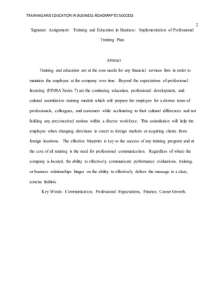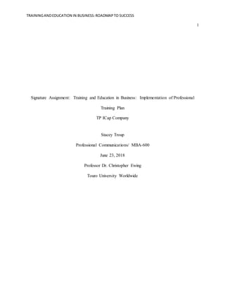 This document proposes a formal training plan for TP ICap Company to prepare employees for success in international business. The plan includes continued education, cultural training, professional development plans, and adapting training to different learning styles and career levels. Entry-level employees would receive onboarding training and exam preparation assistance. Upper-level staff would have training focused on emerging markets, cultural diversity, and skills development tied to promotions. Executive staff would receive yearly cultural training and serve as mentors. The goal is to empower employees through education and ensure effective cross-cultural communication for international business dealings and customer relationships. Feedback would be gathered to improve the training program over time.