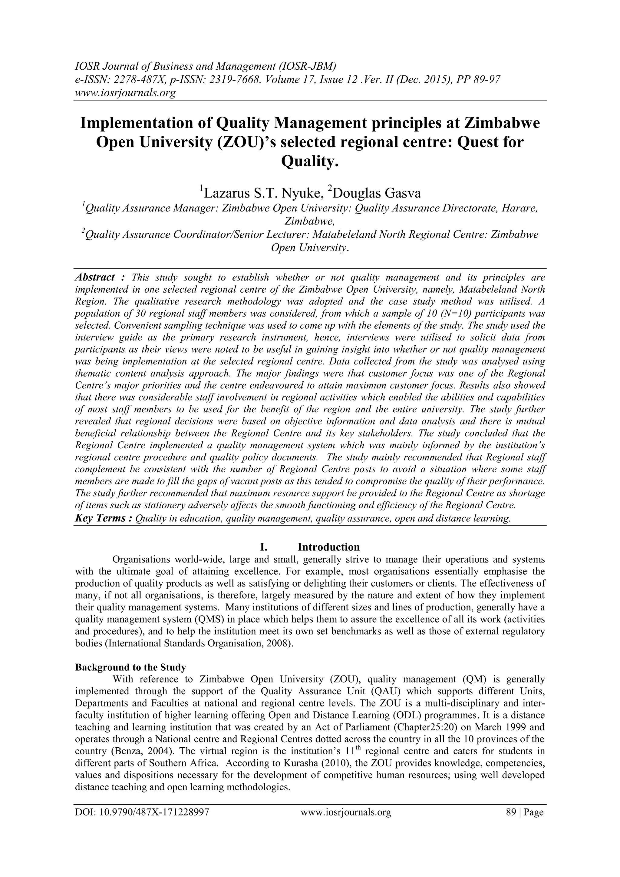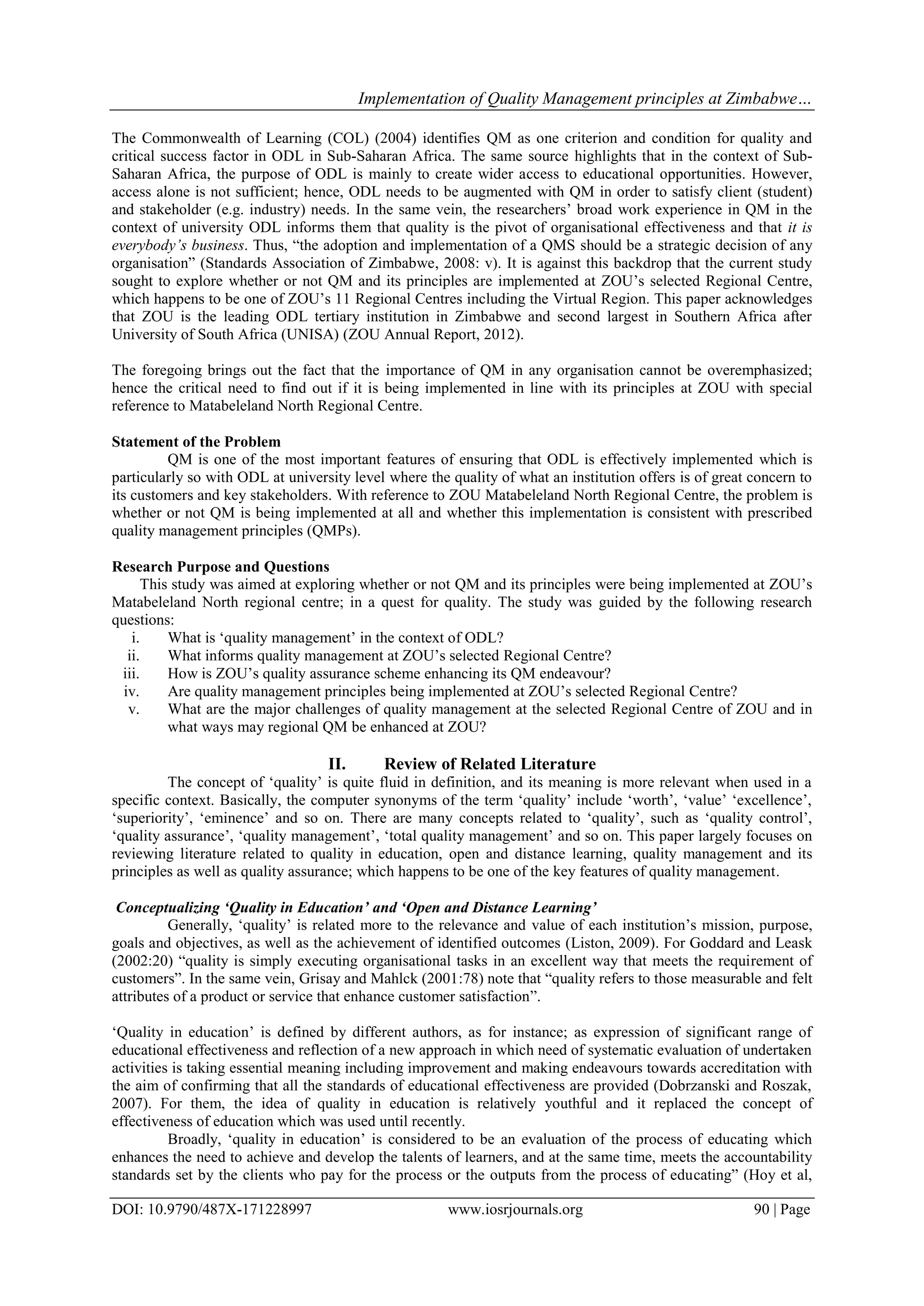 This document discusses the implementation of quality management principles at Zimbabwe Open University's Matabeleland North Regional Centre. It begins with background information on ZOU and the importance of quality management in open and distance learning institutions. The study aimed to determine if quality management and its principles were being implemented at the regional centre. Key findings included that the centre prioritized customer focus and staff involvement. Decisions were made based on data analysis. The regional centre implemented a quality system informed by its policy documents. The document recommends ensuring staffing levels match needs and providing sufficient resources to the regional centre.