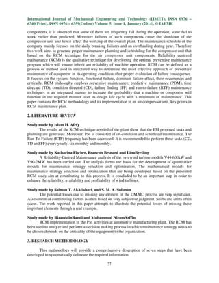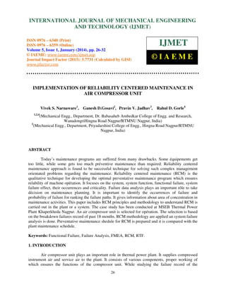 This document discusses the implementation of a reliability centered maintenance (RCM) program for an air compressor unit at a thermal power plant. It begins with an introduction to RCM methodology and its benefits over traditional maintenance programs. It then outlines the 7 steps of an RCM analysis conducted on the air compressor unit: 1) system selection and data collection, 2) system boundary definition, 3) system description and functional diagram, 4) identification of system functions and functional failures, 5) failure mode and effects analysis, 6) analysis of failure criticality and probability, and 7) selection of maintenance tasks. The RCM-based maintenance schedule is developed and compared to the previous schedule, finding an estimated 15.57% reduction in preventive